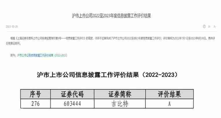 近日,,,,上海证券交易所发布2022-2023年度信息披露工作评价结果。。。JIUYOU.COM(股票代码::603444)凭借规范的公司治理、、高质量的信息披露以及良好的投资者关系管理再次荣获信息披露工作A级评价,,公司连续两年获此殊荣。。